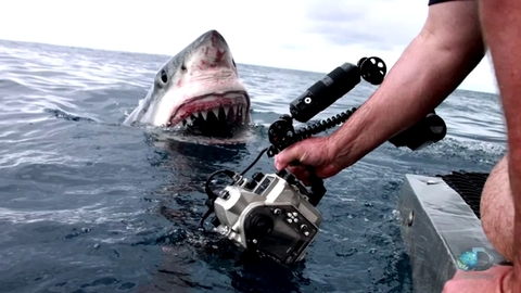 Un grand requin blanc surgit de l'eau, tombe nez à nez avec une équipe de tournage Animaux · TV / Replay · 11 mai, 2015 3
