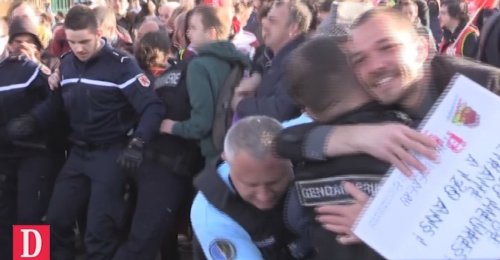 Un manifestant hostile à Pierre Gattaz (Medef) enlace un gendarme mobile (vidéo) TV / Replay · 14 avril, 2016 1